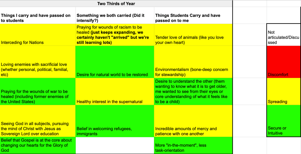 Think of this table as a kind of Venn Diagram. On the left are my interests, on the right are students’ interests, and in the middle are things we have in common. As the colors shift from red to yellow to green, that represents a deepening interest or comfort with a specific topic.